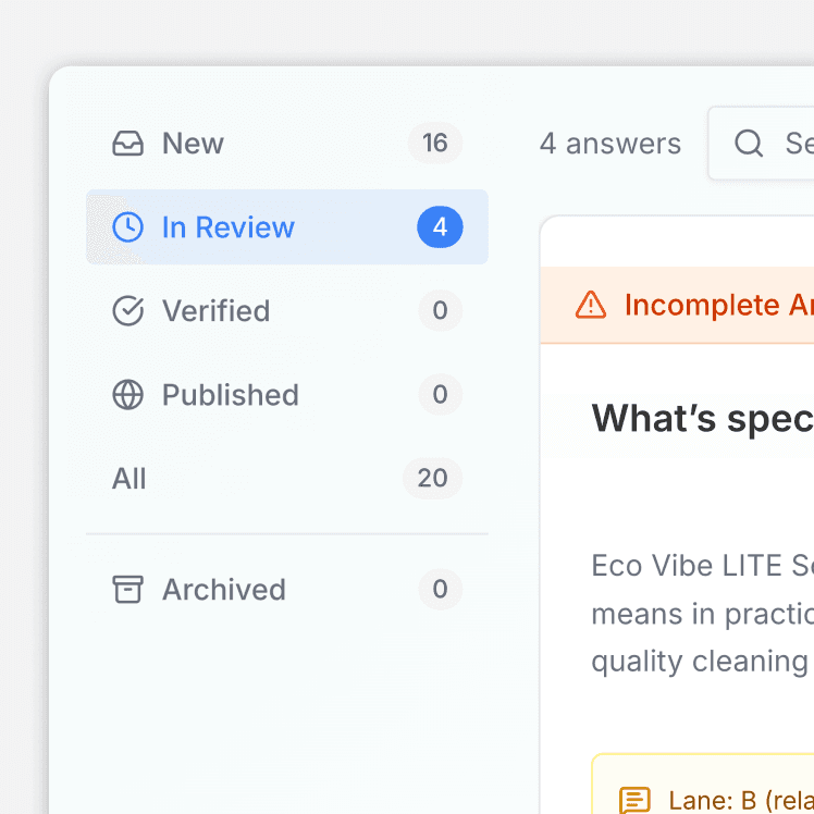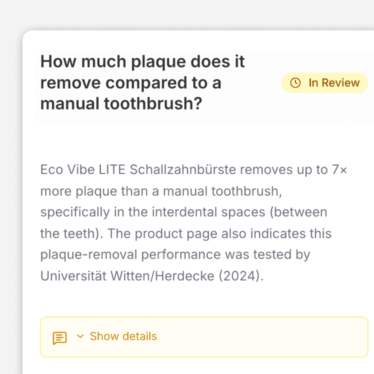 Our Expert-in-the-loop triage platform ensures 100% brand safety by requiring human verification before any answer goes live. This eliminates AI-generated drift, providing the official source signal that AI assistants require to prioritize your products over third-party hallucinations.
