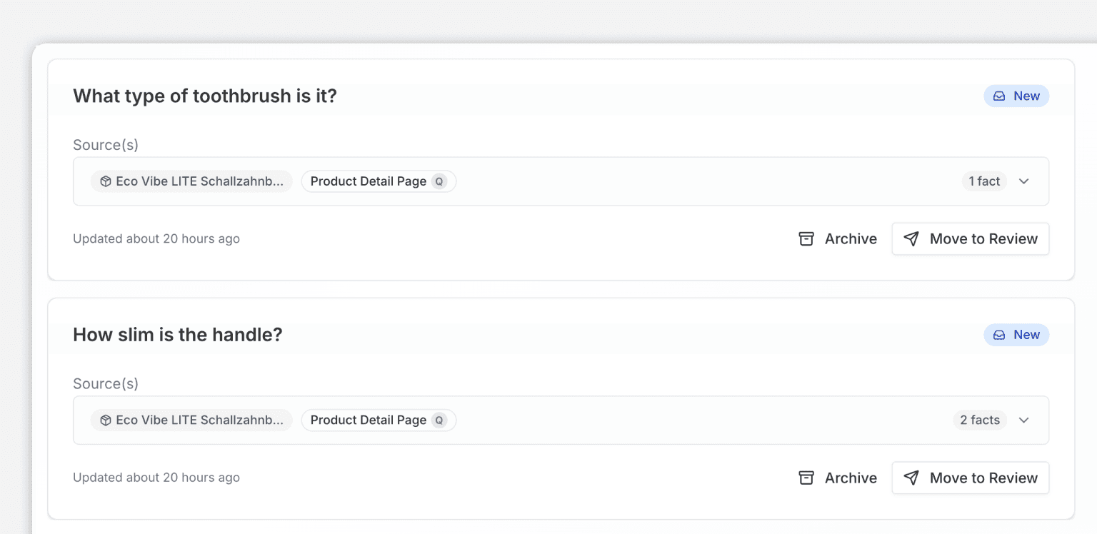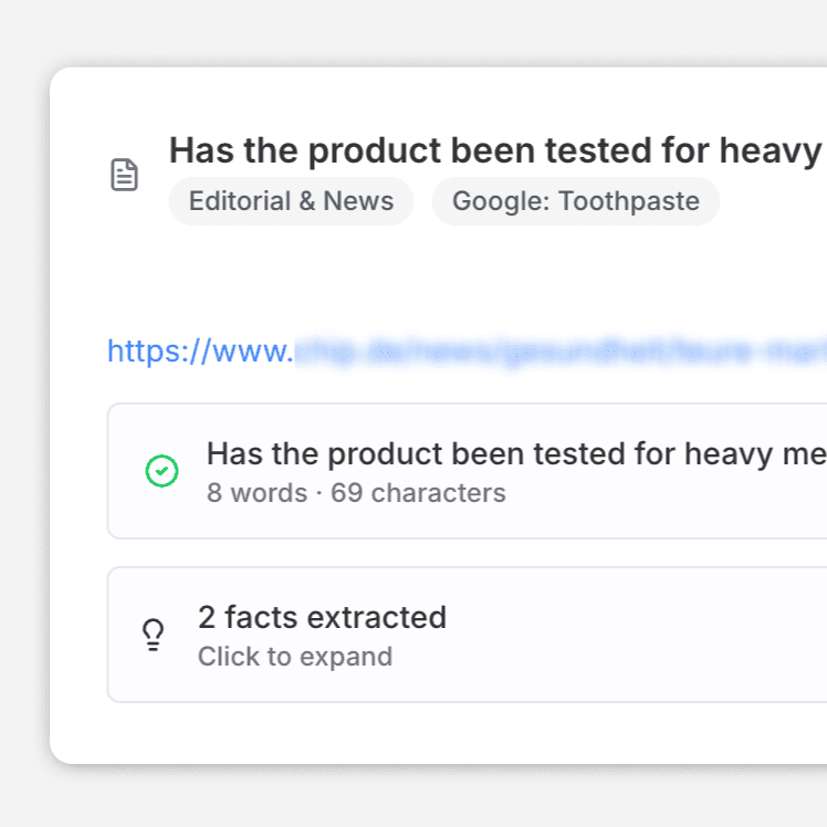 Generate FAQs grounded in product facts from brand product pages, packaging, certifications, reviews and more.
