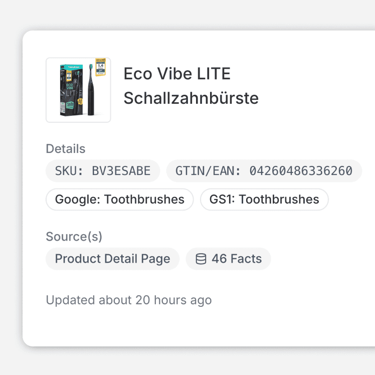 Connect intent to product facts with traceable sourcing, expert sign‑off, GS1-based entity mapping, and always‑on monitoring.